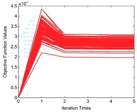 To evaluate the performance of the algorithm better, 80 MC runs were adopted in the experiments below. The objective function value for each iteration in ML is presented in Figure 5. Further, the number of applied data points in ML is determined by the RLS, which has already been discussed above in detail. The estimation converges well within five iterations, and the ML initial objective value is zero because the initial is determined by Equation (4) and .