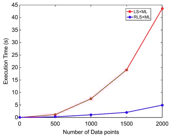 Moreover, RLS/ML was slightly better than LS/ML in the table, not obvious, because RLS and LS all could provide good initial estimation in most experiments. In this situation, the proposed RLS/ML could effectively shorten the computational time due to the iterative operations of RLS, as is presented in Figure 6. This was also one of the main superiority of the proposed algorithm. For example, in the test above, the LS/ML performing the calibration including 3000 samples needed 282.1227 s, while the RLS/ML only needed 46.1559 s.