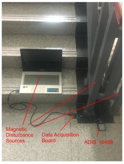 To further evaluate the performance of the proposed algorithm, calibration experiments were conducted, which are discussed in this section. The algorithm was implemented in the ADIS16488BMLZ platform (ADI Inc.), which comprised of a triaxial gyroscope, triaxial accelerometer, triaxial magnetometer, and pressure sensor. The dynamic range, sensitivity, and noise density of the magnetometer are , , and , respectively. Further, the magnetometer signals were sampled at 246 Hz. To validate the proposed algorithm, the sensor was placed in an environment amidst multiple magnetic disturbances from sources including a laptop and a ferromagnetic stair railing, and by the current carried by the sensor, as shown in Figure 7. Moreover, the experiment was conducted by the rotation of the magnetometer around central point because any change in the magnetometer positioning could affect the local magnetometer field.