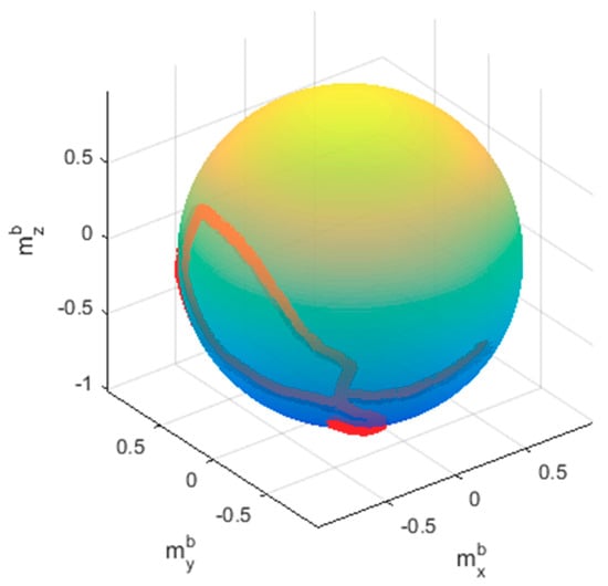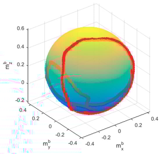 In the second category, the magnetometer calibration is performed with assistance from inertial sensors [,,,,,]. This approach has the advantage that it can perform an alignment estimation of the sensor axes between the inertial sensors and the magnetometer. However, it increases the complexity of the system and may introduce unnecessary errors from the inertial sensors (gyroscope/accelerometer). In actual inertial navigation systems, the alignment error between the sensor axes can be ignored by comparison with the other errors. Thus, magnetometer calibration using only the information itself is the main objective of this research.