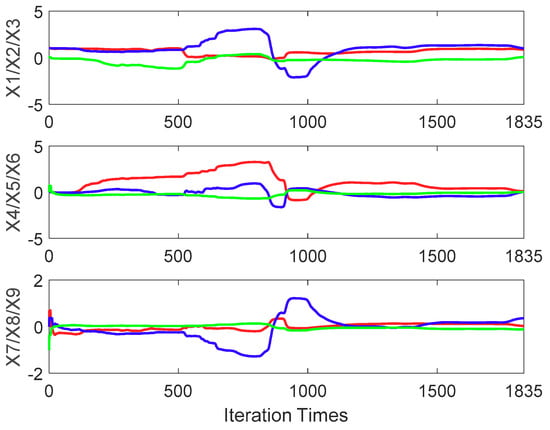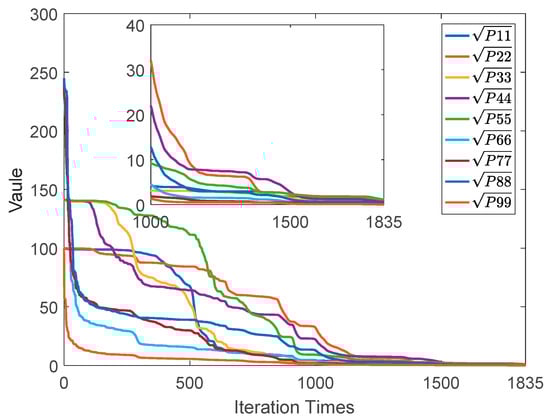 The real-time state vector estimation results and the parameters of the covariance matrix are shown in Figure 9 and Figure 10, respectively. The final number of data points was set as 1835, according to the above-mentioned condition. Moreover, the state vector and the covariance matrix tended to be stable after 1835 iterations, which agreed well with the simulation results above.