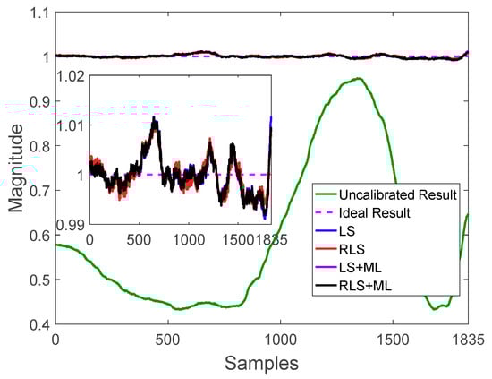Figure 4 plots the magnitudes of all the data points before and after the application of the iterative calibrated algorithm. The convergent point in the proposed estimation method is , which was used to calculate the magnitudes of all the data points. As shown in Figure 4, the magnitude of the data points of the proposed algorithm wavers near 1 with a small error, which corresponds well with the theory above (shown in Equation (4)). Moreover, it must be noted that although the later 105 data points were not used in the calibration, their magnitudes were steady, which clearly demonstrates the superiority of the proposed algorithm.
