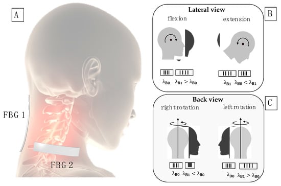 Regarding the wearable system, the analysis of the neck movements’ detection was performed as follows: (i) the changes of FBG1 output were used to evaluate FE movements since the chin lowered down toward the chest causes a longitudinal deformation of FBG1; (ii) the changes of FBG2 output were considered to evaluate AR movements, as the right and left rotations of the head around its vertical line (y-axis in Figure 4A) causes a longitudinal deformation of FBG2.