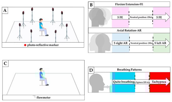 (A) Experimental set-up to assess the feasibility of the proposed system for monitoring neck movement; (B) experimental protocol for monitoring FE and AR movements; (C) Experimental set-up to assess the feasibility of the proposed system for respiratory frequency monitoring; (D) experimental protocol for fR monitoring.