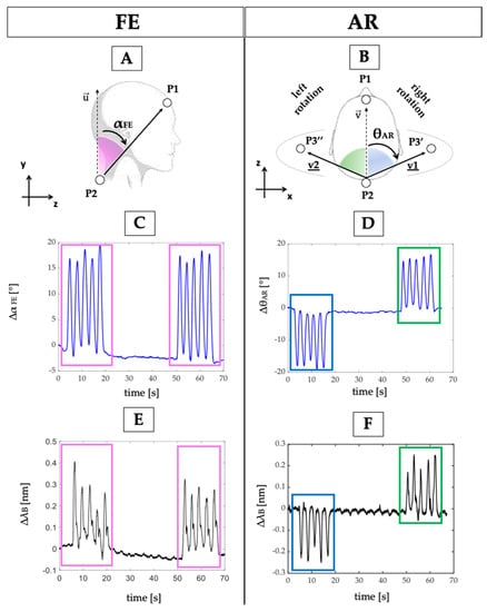 - the FE and AR repetitions were detected by using a custom peak detection algorithm in MATLAB environment. FE movements were detected by considering the maximum peaks of both MoCap and FBG1 signals: when increases during the neck flexion (signal provided by the MoCap) FBG1 is strained with a consequent increase of λB (Figure 5A,B). Right AR movements were detected by considering the minimum peaks of both MoCap and FBG2 signals: when θAR decreases during the right AR (signal provided by the MoCap) FBG2 is compressed with a consequent decrement of λB (Figure 5C). These data were collected during the first 5 AR repetitions; left AR movements were detected by considering the maximum peaks of both MoCap and FBG2 signals because when θAR increases during the left AR (signal provided by the MoCap) FBG2 is strained with a consequent increment of λB (Figure 5B). These data were collected during the last 5 AR repetitions.