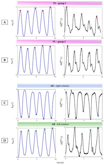Figure 5. (A) The peak detection during the first group 5 FE, (B) the second group 5 FE right, (C) right AR repetitions, (D) left AR repetitions.