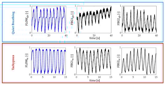 - The outputs of the wearable system and the flowmeter were normalized in amplitude and split into quiet breathing-related signals and tachypnea-related ones (i.e., FBG1qb, FBG2qb, FLOWqb, FBG1tc, FBG2tc, and FLOWtc), as shown in Figure 6;