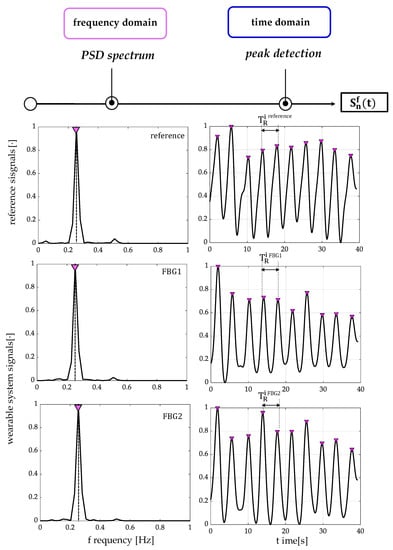 - spectral analysis in terms of power spectral density (PSD) was performed on the filtered signals and the maximum frequency (f0) of both the reference and the wearable systems signals were evaluated (Figure 7);