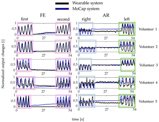 The output changes of both the wearable (black line) and the Motion Capture (MoCap) system (blue line) collected during FE and AR repetitions.