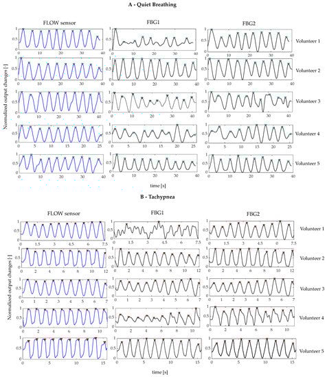 (A) signals collected by the flowmeter (blue line) and the FBGs (black lines) for each volunteer during quiet breathing and (B) during tachypnea. All the signals are synchronized, filtered, and normalized. The detected peaks are highlighted by using red markers.