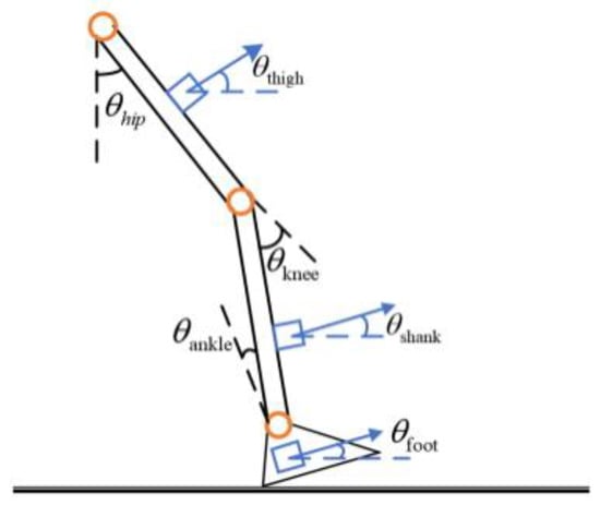 Inertial measurement unit (IMU), including accelerometers, gyroscopes, and magnetometers, is the most widely used wearable sensors in clinical research and are often used in place of professional optical motion capture systems [,,,]. The principle of measuring the hip and knee angle corresponding to the inertial sensor arrangement is shown in Figure 1 and Formula (1).