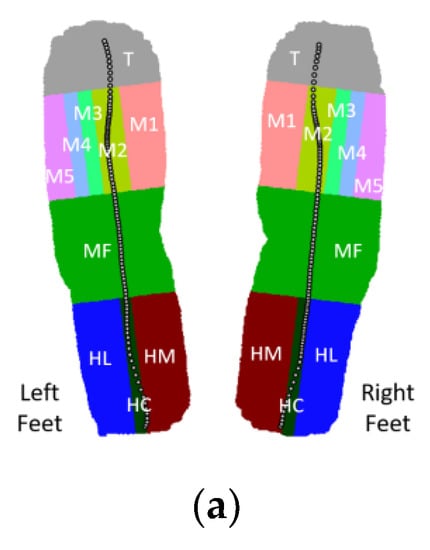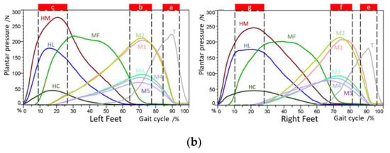 The wearable insole, with built-in pressure sensors, is designed to easily measure the interaction between the sole and the ground and is used to detect foot events and body weight distribution [,,,]. The pressure distribution of the foot region measured by the Novel Pedar-X insole foot pressure distribution measurement system is shown in Figure 2a. Taking the 65 kg subject as an example, the pressure curve of each region during a gait cycle is plotted, as shown in Figure 2b. The main focus is on the thumb area (T area), the first metatarsal area (M1 & M2 areas), and the heel area (HM, HL & HC areas), so we arrange the pressure sensors for these three areas. As shown in Figure 3, the positions of the force sensors, we chose, for the left foot are a, b, and c, while that for the right foot are e, f, and g.