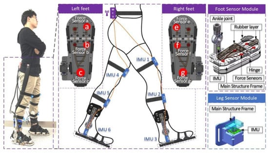 The overall design of the wearable gait analysis system is shown in Figure 3. It includes a total of 3 IMUs at the thigh, calf and foot of each leg, and 3 force sensors at the sole of each foot. The foot used in our system is flexible as, it is part of an exoskeleton []. We transformed and corrected the data collected by the sensor, which is very accurate compared with the data collected by Vicon motion capture system. This is explained in detail in the results section, which proves the effectiveness and validity of our research tools.