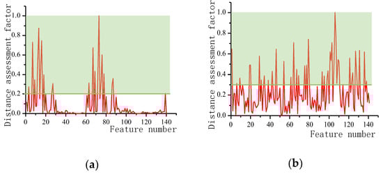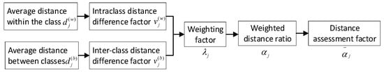 For the high-sensitivity feature, the distance between sample points of different categories in the feature space is as large as possible, and the distance between sample points within the same category is as small as possible []. Using this as a criterion, the ratio of the average distance between the classes in the training sample set and the average distance within the class can be calculated. The calculation process is shown in Figure 4. The large evaluation factor means a more dense intra-group distribution and a more discrete group distribution, and the trained classifier makes it easier to distinguish between multiple categories.
