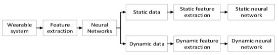 A three-layer BP neural network structure, with the neurons of the input layer, the hidden layer, and the output layer with labelled i, j, and k, respectively []. The parameter settings of each neural network in the recognition model are shown in Table 3. The function of the first neural network is to distinguish between dynamic and static data. As the recognition difficulty is low, so the number of input nodes was set to 5. The number of hidden layer nodes is 25. The input of the static neural network is a sensitive 20-dimensional feature, so it contains 20 input nodes, and the hidden layer was set to 100 nodes. The number of input layer nodes in the dynamic neural network was 40. Since there are many recognition classes and many similar gaits, it is difficult to identify. So, the number of hidden layers was set to 200.