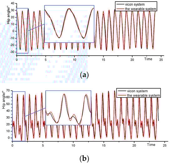 (a) Hip angle comparison curve; (b) Knee angle comparison curve.