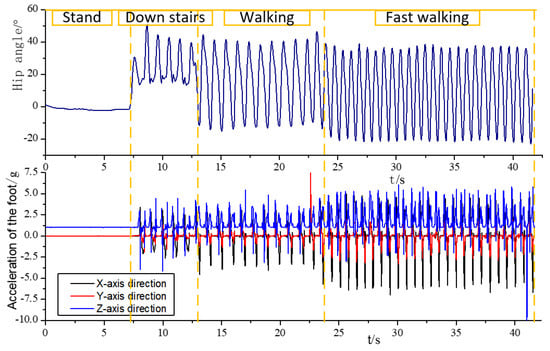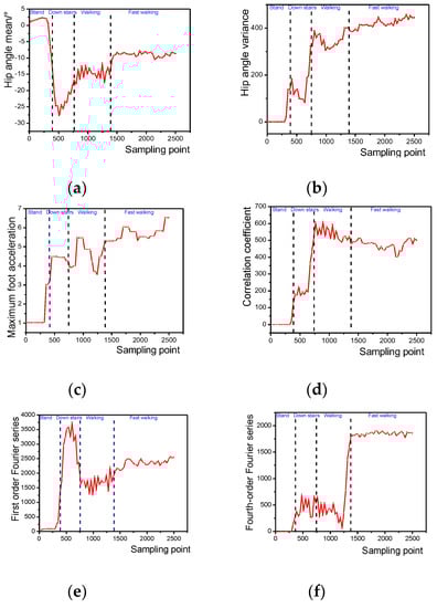 We performed the four movement modes of standing, descending stairs, constant speed walking and fast walking in a sequence and collected gait data. As shown in Figure 8, the hip joint angle and the three-axis acceleration of the foot during the period were changed. The preprocessing and windowing interception operations were performed to obtain the variation law of various feature values with time as the data window slides, and the sensitivity of various features to the motion state is analyzed accordingly. The result is shown in Figure 9.