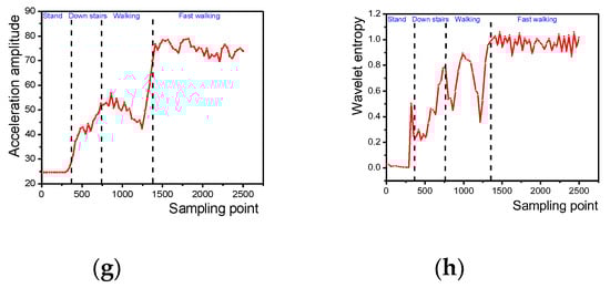 In the energy characteristic parameters, we selected the magnitude of the acceleration signal and the wavelet energy entropy. The integral of the triaxial acceleration vector with respect to time, SMA (the magnitude of the acceleration signal), in a certain period of time can indirectly reflect the energy consumption of the human body during the period of time, which is very different in various types of activities of the human body and act as a parameter to distinguish between human activity and static state. Wavelet analysis is a commonly used time-frequency analysis tool in the field of pattern recognition. The feature signal obtained after wavelet decomposition contains more time domain information in addition to frequency domain information. The wavelet entropy can detect the motion mutation point well and can be used as a feature for classification.