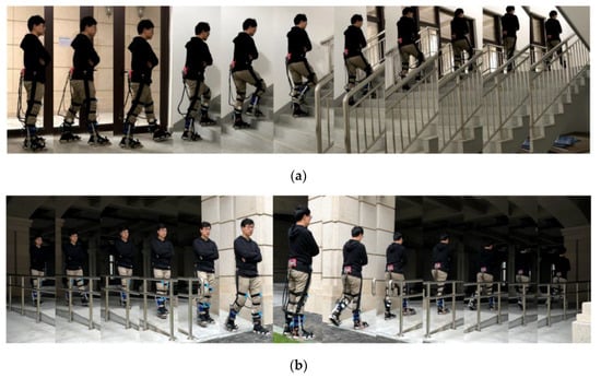Two sets of mixed motion experiments were designed based on the existing terrain. The first set of experiments was set up for horizontal pavement and stair mixing. The subjects transitioned from horizontal ground speed to single step upstairs, followed by continuous upstairs and two regular speeds. The process of the first set of mixed motion experiments is shown in Figure 11a.The second set of experiments was for horizontal pavement and slope. Mixing, the subject moved from standstill to the lower slope, then transitioned to the horizontal ground at a constant speed, stood still before the rising slope, and then climbed up the slope. The process of the second set of mixed motion experiments is shown in Figure 11b. In these experiments, each of the stairs was 29 cm wide and 15 cm high, and the slope inclination was 20°.