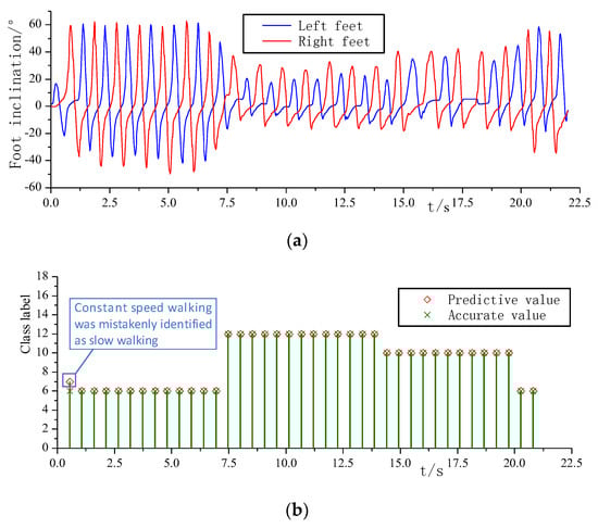 (a) Foot inclination during horizontal road and stair movement; (b) Identification results during horizontal road and stair movement.