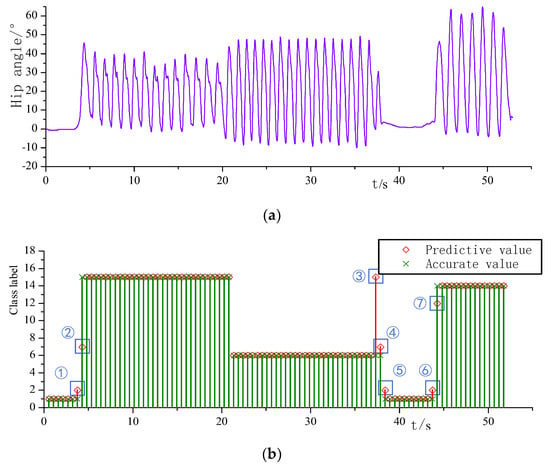 The experimental results of the horizontal pavement and the slope pavement are shown in Figure 13. The curve of hip angle during exercise is shown in Figure 13a. The hip joint angle fluctuation during the stationary standing phase is small. When the thigh is forward and the hip joint angle is increased, began to enter the lower slope stage. The last 14 gait cycles are the lower slope process, and the lower slope phase is limited by the terrain. To ensure the stability of the body, the step size was kept small, so the hip joint flexion angle is also small. While entering the horizontal road at constant speed, the stride is obviously increased, and the hip joint peak increases in a single gait cycle. At the same time, the pitch frequency has also increased, and the duration of a single gait cycle has been shortened. While completely stopping in front of the rising slope, the hip joint peak at the last step of the horizontal road at constant speed is significantly smaller. The slope is started after standing still for six seconds in front of the slope. During the motion on the upward slope, the hip flexion peak increased to the ground uplift, and the entire experiment was completed. Figure 13b is a comparison of the recognition result and the standard value. Referring to Table 1, the stationary standing label is 1, the lower slope label is 15, the normal speed walking label is 6, and the upper slope label is 14. The number of windows is 97, the number of misidentifications is 7. The overall recognition accuracy is 92.7%, and the recognition accuracy is high in the stable phase.