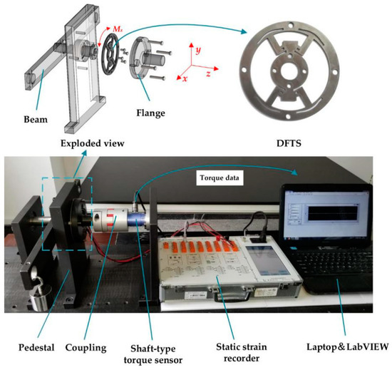 Then, the inner ring, allowed to have one free translational degree of freedom in the motion direction, was linked to the beam loaded by a mass through a bearing. Thus, a pure clockwise or counterclockwise torque was produced by placing a mass on either end of the beam. The measuring torque range of DFTS is from −10 to 10 Nm, computed by , where m is the mass, g is the gravitational acceleration and d is the distance away from the center. The outer ring is connected to the shaft-type torque sensor through a flange and a coupling. The right end of this sensor is fixed through four bolts on a pedestal. This shaft-type torque sensor was used to obtain the loading torque value displayed by LabVIEWTM. The relationship between the strain and torque is shown in Figure 13a.