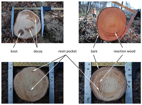 Rot is caused by a variety of fungi that break down and digest wood chemical components. Fungi attack wood according to their specific enzymatic system. Brown-rot fungi have limited impact to lignin structure; however, they easily degrade polysaccharides. White-rot fungi have the capability to degrade mainly lignin structure but also carbohydrate wood cell components (cellulose and hemicellulose) []. Rot is the wood defect for which quality grade reduction is obligatory. Rot fungus enters the tree through a root, broken branch, damaged treetop or scar on the stem. Logs cut from older trees are suspected to contain more developed rot. The final stage of rot is a complete or extensive material loss forming internal cavities.