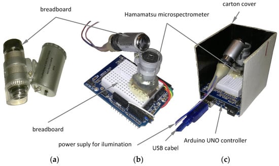 In addition, Hamamatsu C12880MA and C11708MA (Hamamatsu City, Japan) micro-spectrometers were identified as low-cost instruments potentially useful for measuring experimental samples. Both sensors cover different spectral ranges, including 340–780 nm (29,411–12,820 cm−1) and 640–1050 nm (15,625–9524 cm−1) for HamamatsuVIS (C12880MA) and HamamatsuNIR (C11708MA), respectively. The commercially available hardware included only a spectrometer module integrating optical and electronic components assembled together in a compact and resistant box. It was necessary, therefore, to build fully functional instruments by adding focusing optics, illumination and signal processing units. Detailed description of the developed prototype instruments is presented in the following chapter.