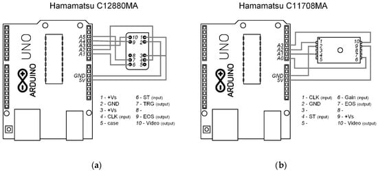 Connection diagram of Hamamatsu C12880MA (a) and C11708MA (b) micro-spectrometers to the Arduino UNO microcontroller.