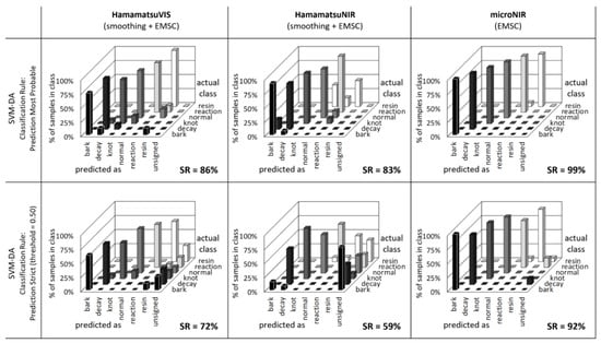 The greatest advantage of PLS-DA is a possibility for the model interpretation by means of loadings. However, the practical implementation may not be optimal as not all the variance within source data may be represented by a limited number of principal components. Therefore, it is frequently applied to use machine learning algorithms for data representation and identification. Support Vector Machine is one of these routinely used tools for spectral data processing and was, therefore, implemented to assess the identical data set as in PLS-DA. Confusion tables for resulting SVMC models obtained are presented in Figure 9, assuming both classification rules. The success rate for all sensors is evidently higher than those obtained with PLS-DA. Only a few samples were misclassified, mostly in the case of Hamamatsu NIR and resin mixed with normal wood. The performance of the microNIR sensor was nearly faultless even if implementing “Prediction Strict” rule for classification. The number of unsigned samples was considerably lowered for both Hamamatsu prototype sensors. It was assumed, therefore, that the overall performance of the SVMC was superior to PLS-DA. Unfortunately, no direct interpretation of the model was possible and only the independent validation was proof of the model reliability.