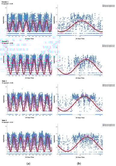 Example illustration of poor fit of cosinor model to observed 7-day activity data of the 4 individuals depicted in Figure 1. (a) Figures on the left illustrate the activity rhythm over the entire week whereas (b) figures on the right illustrate the overall activity pattern over a single 24 h period. As evident by both figures, the cosinor approach results in extremely poor fit of the model to observed data (mean R2 of the entire sample = 0.35, SD = 0.11).