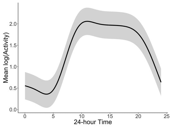 The main goal of our approach was to better characterize the observable behavioral phenomenon of BAR that involves four distinct features: (1) a period of sleep and quiescence, (2) a period of increased activity in the morning, (3) a relative plateau period of wakeful activity with some daytime activity changes, and (4) a period of “winding down” or decreasing activity as the next quiescent/sleep period approaches. For this, the accelerometer-derived minute-by-minute activity levels (60 s epoch lengths) were aggregated over seven days for each individual. Similar to previous studies that used this aggregation approach for visualization [38,41,46,58], actigraphy-derived activity can be plotted to summarize diurnal changes in activity with a better face validity. Data aggregation was done using both mean and median; as no differences in results were seen, we present only mean aggregation. As seen in Figure 1, there are marked differences in individual patterns but all follow a similar pattern indicating a period of nighttime inactivity, increase in activity in morning, changing activity pattern during the day with some “dips” of lower activity, and a final decrease of activity at the end of the day until the next period of sleep. Figure 3 shows the aggregation for the entire sample which is greatly smoothed in comparison to the individual plots. This graphical approach of aggregated data (Figure 1) provides a more accurate visual representation of the observable behavioral phenomenon of BAR when visually compared to cosinor approach (Figure 2) using the same individuals.
