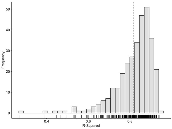 Frequency histogram for R2 values from the GAM model for each participant in the sample (n = 316). The dashed line represents the mean R2 value for the whole sample (R2 = 0.82, SD = 0.09).