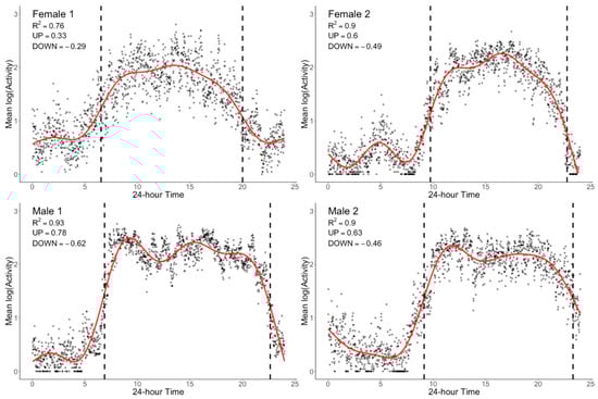 Examples of the smoothed curve (red line) produced by a generalized additive model with aggregated longitudinal actigraphy for the four older adults presented in Figure 1 and Figure 2. R-squared, UP slope and DOWN slope values are presented for each participant, with the dashed lines representing the 24 h time at which the UP and DOWN slopes were calculated (i.e., the time in which the change in activity counts was greatest). It can be seen that the smoothed curves reliably reflect individual changes in activity across the average 24 h period.