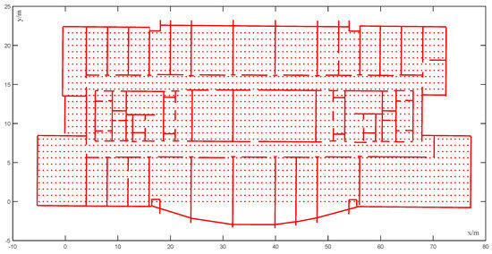 Map matching can be divided into two types: point-to-point matching and trajectory matching. The point-to-point matching method matches the position point with the position of the indoor space according to the floor plan. This method is simple and computationally efficient. Trajectory matching is the matching of the motion trajectory obtained by the initial positioning system with the geometric topology information of corners, corridors, and rooms. This method is highly accurate but computationally intensive. In this study, the map matching of the conditional random field model was adopted, and the point-to-point matching method was more suitable for the visual–inertial positioning system. The method covered the entire indoor area with equally spaced points and stored the coordinates of each state point [9]. At the same time, we removed the state point of the unreachable area. In Figure 3, the red points indicate a state point, while the red lines indicate an indoor structure.