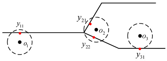 Newson and Krumm proposed a map matching algorithm to find the optimal moving trajectory sequence based on the location of the anchor point and the error radius [17]. In general, map matching associates each anchor point with all the candidate road segments located within a preset error radius, as shown in Figure 5. In the method based on the conditional random field model, the position coordinate point is regarded as an observation state. Each candidate path represents a hidden state; that is, a hidden state represents a candidate state point. In this study, each candidate path represented the point closest to the observation point on the candidate path. The probability of observation depends on the distance between itself and the anchor point. It is intuitively assumed that candidate state points closer to the anchor point have higher observation probability. In the real state, there is a measurement error in the distance between the anchor point and the candidate state point, generally assuming a zero-mean Gaussian distribution. For a given observation point and candidate state point , the observation probability is and can be expressed as follows: