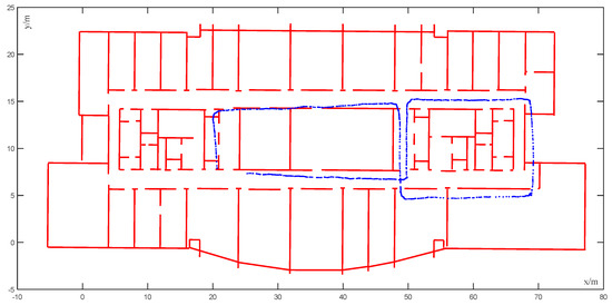 In the experiment illustrated in Figure 12, complex movements such as 180° turns and 360° turns were carried out several times, which enriched the scene transformation. In addition, some lamps in the corridor were damaged, and the light and the shade of the corridor were obviously changed, while the positioning error increased gradually with an increase in time; furthermore, the phenomenon of passing through the wall was serious (average cumulative error = 3.43 m). At this time, the moving speed of the robot was 2.5 m/s, which was relatively fast. Although the primary estimated trajectory crossed a number of walls, this was corrected successfully by using the map matching algorithm, and zero obstacles were crossed by the map matched trajectory, as shown in Figure 13. The mismatch rate was 2.94% when the initial positioning system was noisy and the error was large. As we can see, there were still some unreasonable matching points in the corner, compared with the actual trajectory of the robot; the algorithm proposed in this paper could estimate the trajectory of the robot well and meet the requirements of room-level positioning accuracy.