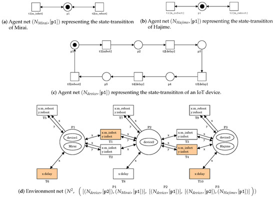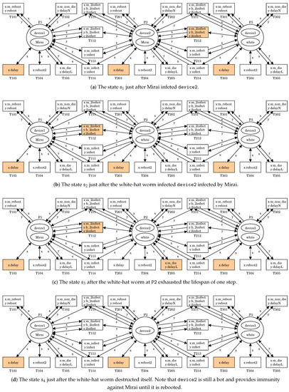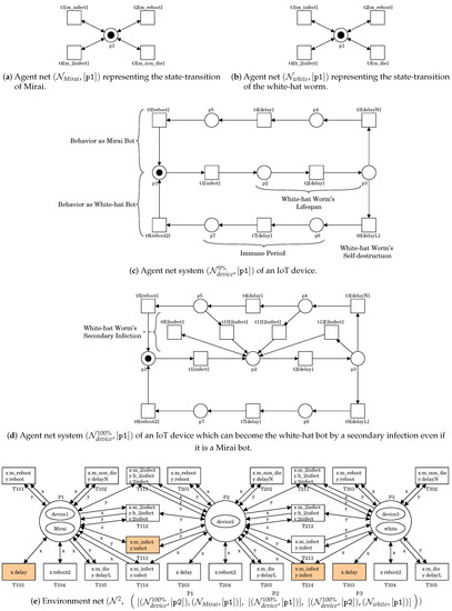 Figure 4d shows the agent net , where the possibility of this white-hat worm’s secondary infection is 100%. That is, the white-hat worm can always infect the device infected by Mirai. In , the four states and mean that the device is a Mirai bot. Transitions t9, t10, t11, and t12 respectively represent the white-hat worm’s secondary infection actions. The firing of one transition results in the state in which the white-hat worm infected the device instead of Mirai. Since those four transitions one-to-one correspond to all of the four states, the white-hat worm’s secondary infection becomes 100%. We can specify any possibility of the white-hat worm’s secondary infection by the presence of those transitions.