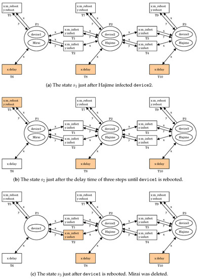 In , there are three firable transitions T6, T8, and T10 because, for each transition, x:delay can be bounded with t2 in . T1 is no longer firable in . This means that Hajime at P2 protects device2 from Mirai. Let us fire T6 three times. It means that the delay time of three steps passed. This results in a new state