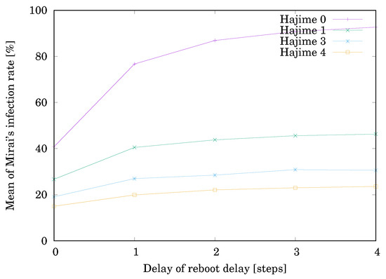 Table 1 shows the simulation result. Each value is the mean of for 10000 trials. The result is illustrated in Figure 3. The horizontal axis shows the delay time until rebooting. The vertical axis shows Mirai’s infection rate . First, let us see the effect of only reboot, i.e., when . Rebooting infected devices drastically reduces the value of when , but the effect is rapidly lost with the increase in . This is consistent with the fact [20] that, if the devices are not updated on security, they can be reinfected within minutes of the reboot. Next, let us see on the effect of Hajime, i.e., when . Hajime reduces the value of to less than half without depending on . decreased with the increase in , but the reduction rate gradually decreased. The reason is that the network became saturated with Hajime.