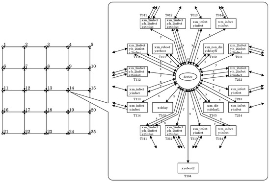 We performed an experiment to evaluate the effect of the white-hat worm. In this experiment, we used the PN model representing a lattice-structured network composed of 25 (=) nodes, i.e., = 25. Each node has one device. Figure 6 illustrates the model.