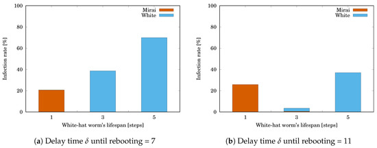 Let us first focus on the white-hat worm’s lifespan. We measured Mirai’s infection rate given by Equation (1) and the white-hat worm’s infection rate after 1000 steps. is given by