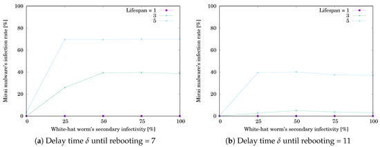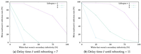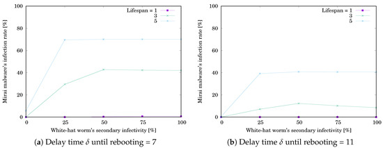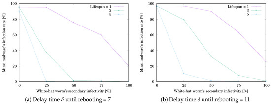 Effect of the white-hat worm’s secondary infectivity on Mirai’s infection rate when . (a) Delay time until rebooting = 7; (b) Delay time until rebooting = 11.