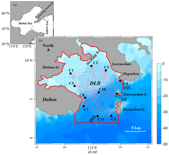 (a) Location map of the Dalian Bay. (b) Model domain of the 2015 Dalian Bay data analysis encircled with thick red line. The 11 acoustic stations (C1–C11) are indicated with black dots and the transmission paths to each station are indicated with thin cyan lines. The southern inlet and southeastern inlets are labelled as DSS, and XSS, and SS, respectively. The 5-km scale is indicated at the lower right corner.