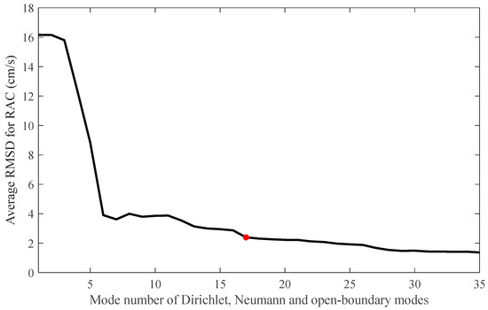 Average root-mean-square-difference (RMSD) of the observed and inverted range-averaged currents (RACs) plotted with respect to the mode number. The red dot indicates the position where the optimal mode number of 17 was determined.