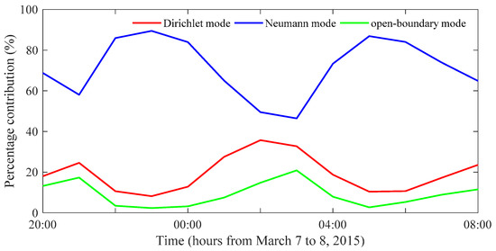 The kinetic energy per unit area was calculated from the inverted currents at all of the grid points inside the model domain and then summed over the entire model domain to estimate the total kinetic energy for each mode. Figure 4 plots the percentage contribution from each mode to the total kinetic energy with respect to time. The mean percentage contributions were approximately 70%, 20%, and 10% for the Neumann, Dirichlet, and open-boundary modes, respectively, which indicated that the Neumann mode had the largest contribution. The temporal variation of the Neumann modes was out-of-phase with those of the Dirichlet and open-boundary modes. The predominance of the Neumann mode is caused by that the major model domain, except for regions near the coast that are dominated by tidal currents in an inviscid fluid. Additionally, the viscous and inviscid components corresponding to the Dirichlet and Neumann modes, respectively, are traded off over the whole model domain.