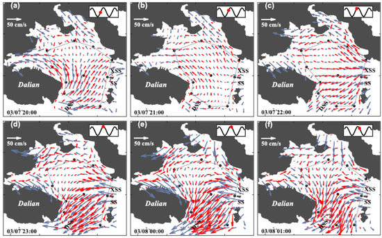 Hourly mapping (a–l) of the hourly-mean horizontal current fields calculated using the CFM (red arrows) and NCM (gray arrows). The observation time and the corresponding sea level height (red dot) are indicated in the lower-left and upper-right corners, respectively.