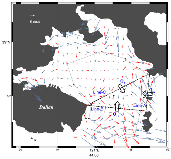 The error velocity for the semidiurnal tidal currents was estimated from the RMSDs between the observed and inverted RACs while using the hourly mean data. As presented in Table 1, the RMSDs averaged over all of the transmission paths were 2.2 cm s−1 and 3.7 cm s−1 for the CFM and the NCM, respectively. The volume transports, QA, QB, and QC across the triangular domain surrounded by Line-A, Line-B, and Line-C at the bay mouth were calculated to evaluate the net volume transport, crossing the triangular domain while using the following formula (see Figure 7):