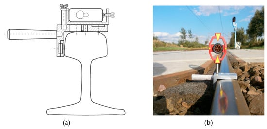 The MMS structure is designed in such a way that the surveying measuring disk can be rotated by 180°, i.e., in the second position, and it has a vertical millimeter scale with concentric rings on the other side. It can then check the horizontality of the parallel rail joint locations and their underestimation (especially those of the traditional fishplate joints). The zero “0” value on the millimeter scale of the surveying measuring disk overlaps with the edge and measuring surface and with the cut of the pointing cross. The structure of the MMS allows it to take measurements to a height of 14 mm below the upper rail running surface or to the lower rail head edge (the most protruding point of the rail head). The MMS has been employed for the measurement of railway turnouts [], the geometry of railway and road crossings, and the structure gauge [,], among other measurements.