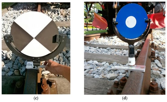 Application of the proprietary Magnetic-Measuring Square (MMS) in monitoring infrastructure of rail transport (own figure and photograph): (a) MMS in the cross section built on the rail head (crown of the rail); (b) MMS with Geodetic Mini Prism Type 111 (GMP111); (c) MMS with High-Definition Surveying (HDS) flat target Black & White and proprietary adapter made of insulating material for assembling reference signals to scanners; (d) MMS with HDS flat target Blue & White and proprietary adapter made of insulating material for assembling reference signals to scanners.